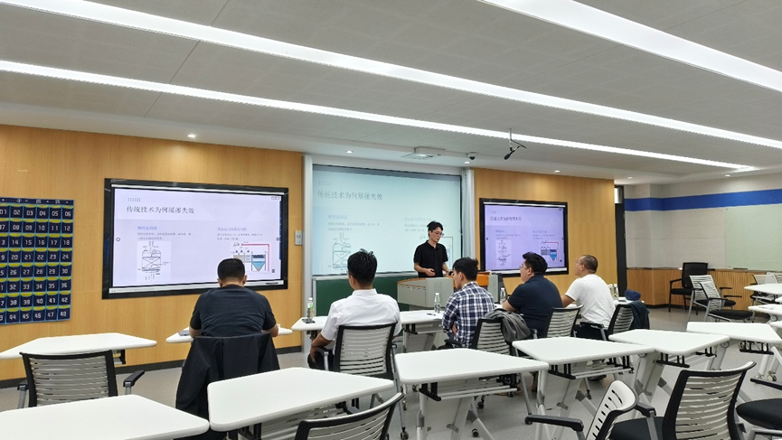工程热物理研究所、“吴仲华班”联合导师韩东江特聘研究员,广东威能检测技术有限公司副总经理朱华,广东迪奥应用材料科技有限公司总经理黄华凛,东莞市秦简计算机系统有限公司首席技术官罗侍田,东莞市美泰喷雾技术有限公司总经理张巍,与校内导师共同组成“学术+产业”双轨评审小组,对学生三个月的选题实践成果进行集中检验。